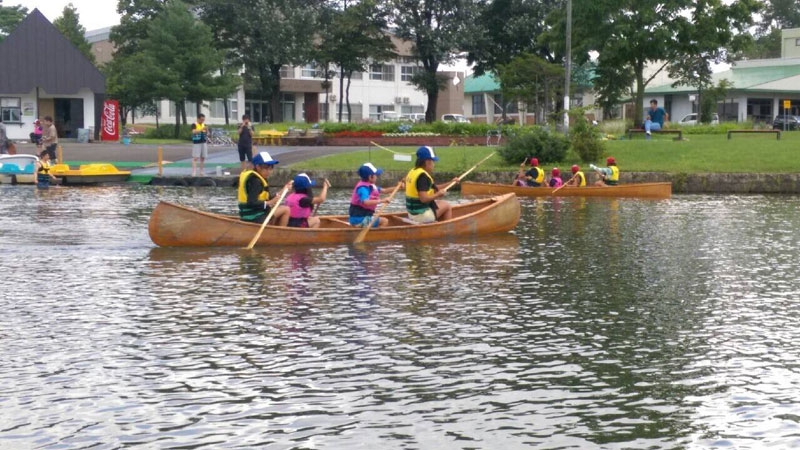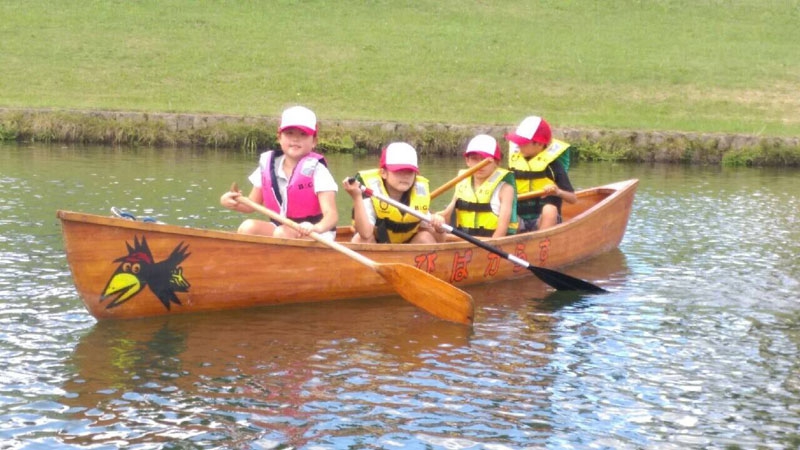 カヌー体験です。 一生懸命こいでいます。晴天に恵まれ絶好のコンディションです。