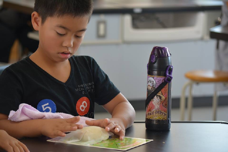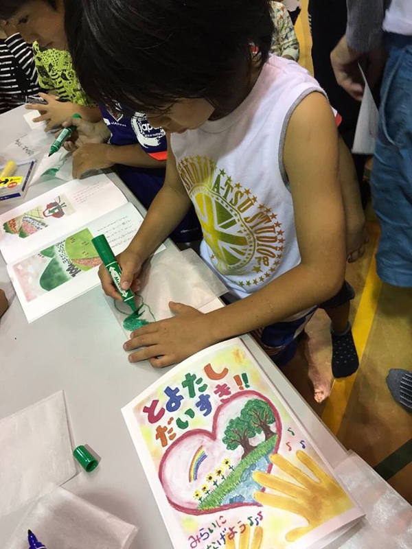最後に、例会を通して学んだ豊田市の歴史の中から、子ども達が「豊田市の誇り」だと感じる事を和菓子の袋に絵を描いてもらいました。やはり、豊田市らしく自動車、豊田市の花ヒマワリ、豊田市郊外の自然環境を描く子ども達が多く、豊田市の名産品である、桃や梨をトッピングしたどら焼きやタルトをお土産に持ち帰ってもらいました。