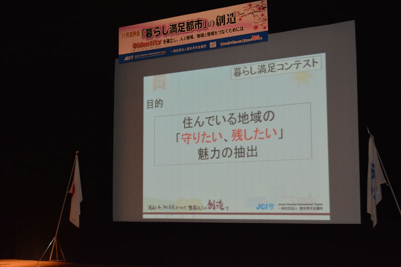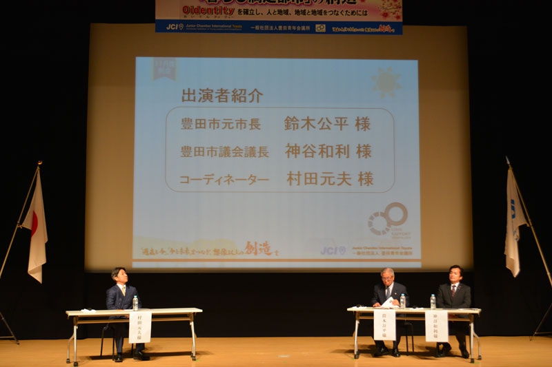 パネリストとして鈴木公平氏(前市長)・神谷和利氏(豊田市議会議長)をお招きし、6月度例会にて提唱したOidentityをシンボルに実施した「暮らし満足コンテスト」や「Oidentity応援サポーター制度」についての報告と検証をパネルディスカッション形式にて行いました。鈴木前市長からは「とても良い取り組みなので長期ビジョンを持って継続してほしい」、神谷議長からは「地域住民が主体的に動き、行政がサポートする共働が大事」というメッセージをいただきました。