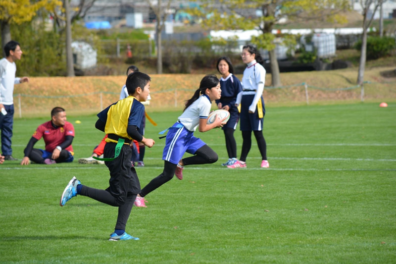 →10月24日(土)豊田市運動公園においてタグラグビーの体験会を開催しました。トヨタ自動車ヴェルブリッツ、名古屋レディースR.F.Cのラグビー選手と触れあいながら、子ども達をはじめ、地域や学校でタグラグビーをご検討中の大人の方や先生方にもご参加いただき、150名を超える方にタグラグビーを体験していただきました。