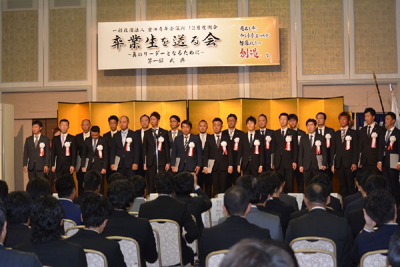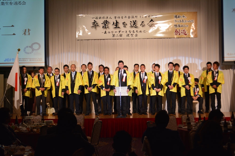 2015年度最後の例会として、卒業生に対し感謝と敬意の気持ちを表し、新たなる旅立ちを祝う「卒業生を送る会」を開催しました。本年度は二部構成とし、第一部式典においては卒業生一人ひとりの挨拶から熱き想いを受け継ぐ学びの場、第二部祝賀会においては卒業生を中心に特別会員と現役メンバーが友情を深める交流の場とさせていただきました。多くの先輩方にご出席いただき、盛大に25名の卒業生を送り出すことができました。