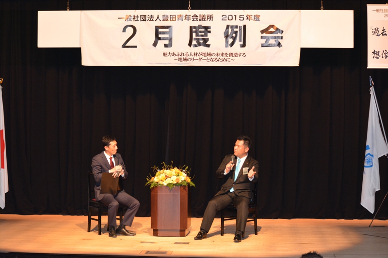 鈴木和也先輩と一般社団法人 豊田青年会議所 理事長 柴田久尚君 によるトークセッションでは、豊田青年会議所の2015年度の活動について『直前会頭が考える豊田市と日本の未来』と題し、客観的な視点から様々なお話を聞くことができ、さらに、私たちの活動に対して温かいメッセージをいただくことができました。